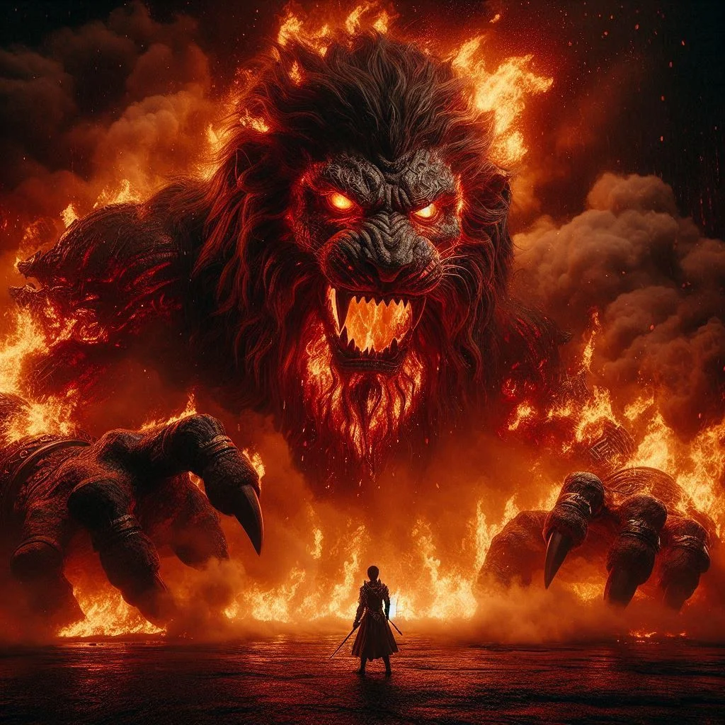 A jaw-dropping, hyper-realistic image of a colossal, furious Giant Lion Titan God, engulfed in flames and smoke, facing off against a minuscule warrior. The titan's fierce gaze and sharp teeth are accentuated by the fiery backdrop, while the warrior's bravery shines through despite the odds. This epic full-length shot is captured in stunning 4K and 8K resolutions, showcasing the incredible level of detail and HDR lighting. The dark fantasy theme is elevated by the Gothic Glitch Core style and the glistening, glassy photo finish. This masterpiece has gained widespread recognition, trending on Artstation and created by the talented Artgerm, utilizing state-of-the-art Blender 3D technology.