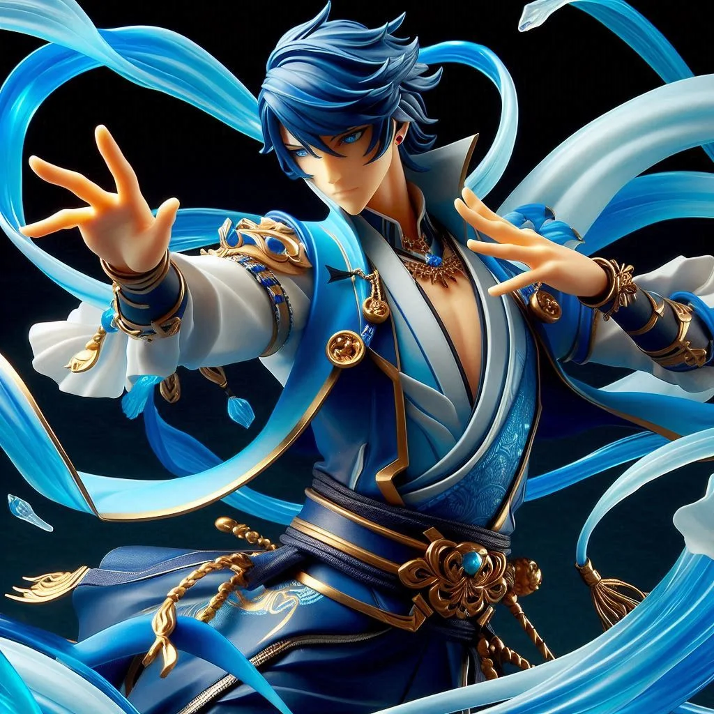 Create an image of a man's figure with blue hair and a dynamic pose, wearing a blue and white outfit with golden accents. The figure should have intricate details such as jewelry on the arms and waist, and be surrounded by translucent blue ribbon-like elements that give a sense of motion.