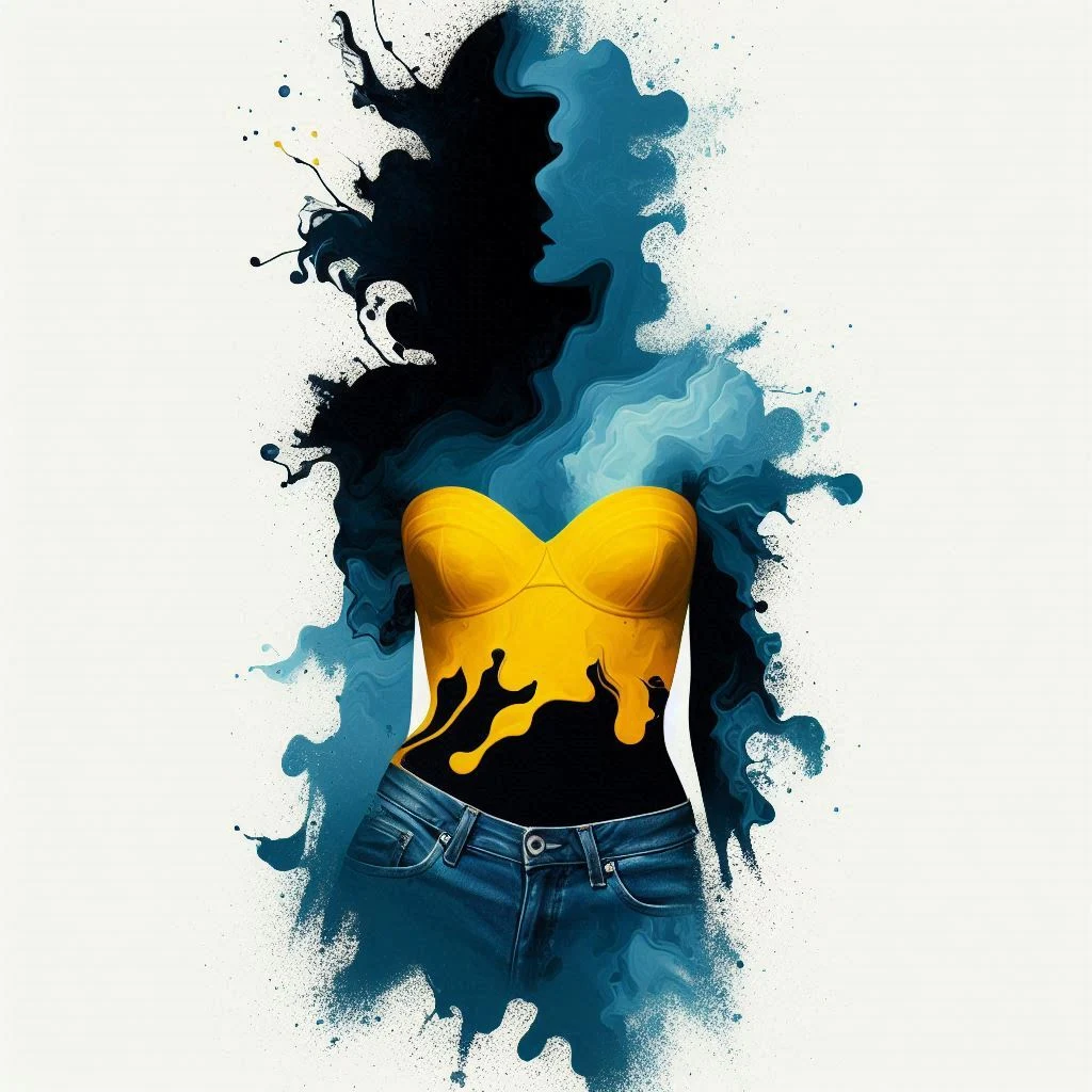 A striking conceptual art piece that showcases an abstract ink-blot painting of a female silhouette. The silhouette is depicted in a full-body portrait, wearing a vibrant yellow bandeau top and blue jeans. The solid colors of the form contrast against the white background, creating a bold and eye-catching effect. The overall composition of the painting emanates a sense of mystique and depth, highlighting the fluidity of the human form and the artistic interpretation of solid colors., painting, conceptual art