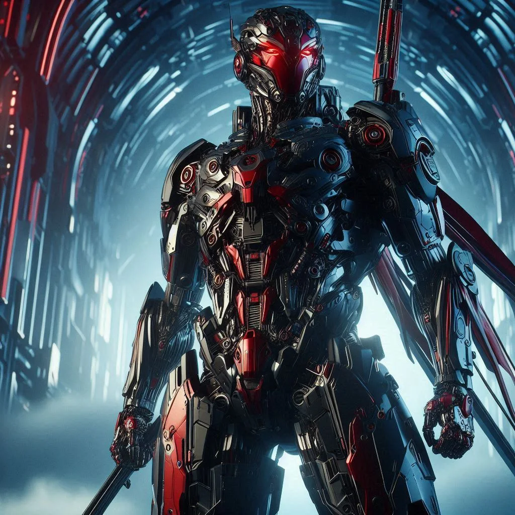 1man, solo, ((color:dark red)), black and red chrome mecha, cyberpunk assassin, full body panel, best quality, masterpieve, UHD, anatomically correct, art, stunning artwork, extremely high quality artwork, beautiful artwork, colorful hyperrealism, beeple colors, blue, red, grey, wide shot, (best quality,4k,8k,highres,masterpiece:1.2),ultra-detailed,(realistic,photorealistic,photo-realistic:1.37),HDR,UHD,studio lighting,