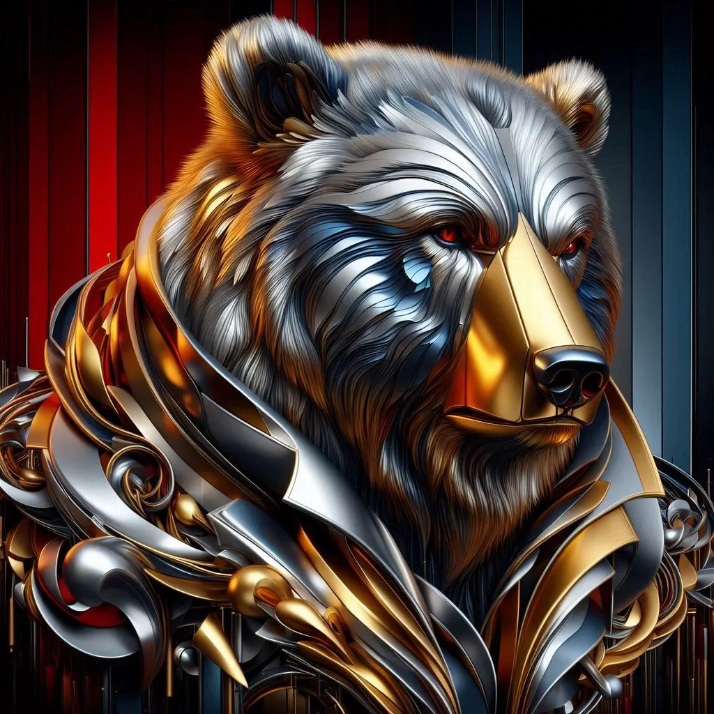 A captivating and conceptually vivid abstract art piece featuring a striking grizzly bear in silver and gold. Exuding strength and power, the iconic figure is vibrant yet metallic, with the entire bear silhouette visible. The background is a dynamic mix of black and red, and the futuristic fashion statement evokes a cinematic grandeur reminiscent of a masterpiece. The 3D representation of the pictorial image brings the conceptual art to life, transforming it into a bold product that embodies the essence of innovation.