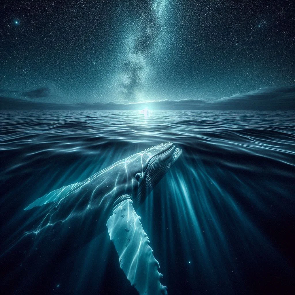Amidst the vast expanse of the night sky, a colossal whale breaks the tranquil surface of the shimmering sea. Its majestic body illuminated by the ethereal glow of the stars, casting long, dramatic shadows upon the rippling waves. The crisp air carries the haunting melodies of its haHa calls, adding to the surreal symphony of the scene. The sky above is a canvas of twinkling lights, a mesmerizing display of nature's beauty. The sea, brightly lit by the moon and stars, unveils its true colors, revealing its depth and mystery. The combination of the towering whale, the night sky, and the sea