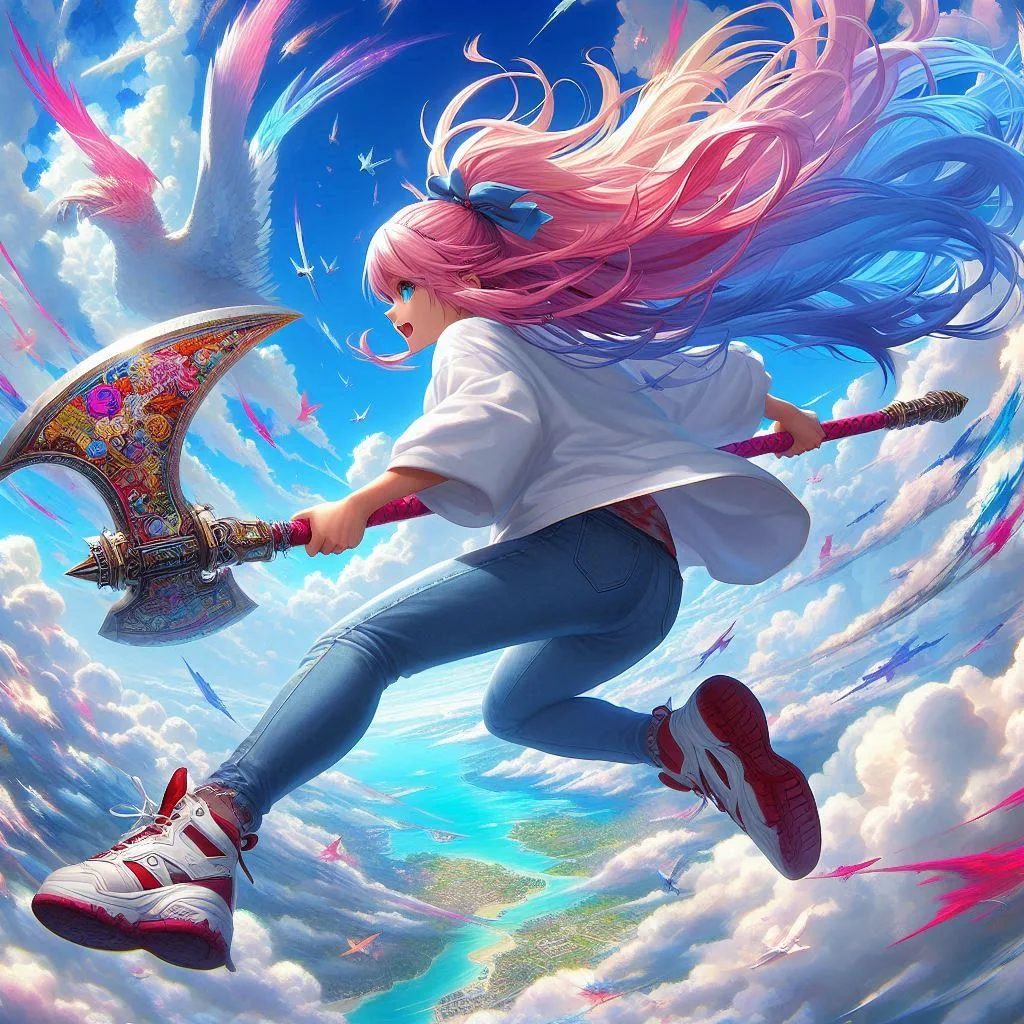 Masterpiece, ponytail hair, pink and white half hair, white oversized t-shirt, long jeans, white sneakers, (8k, highly detailed CG, highly detailed, best shadows), (width: 1.2), flying Edelgard on full body Blue sky holding a huge and colorful Battle Ax and preparing for a dynamic slash, surreal background, 3D rendering, animation 8k, Ukiyo-e