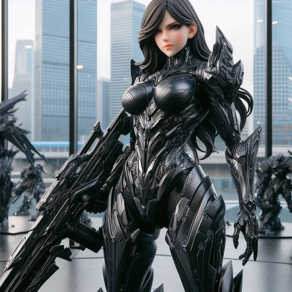 미래형 갑옷을 입은 여성 캐릭터의 전신 뷰를 특징으로 하는 매우 세부적인 디지털 아트워크입니다. 이 슈트는 주로 검은색이며, 금속 실버 악센트가 있으며, 복잡하고 각진 디자인과 첨단 하이테크 요소를 보여줍니다. 이 캐릭터는 길고 흐르는 검은 머리카락과 밝은 안색을 가지고 있으며, 날카롭고 정의된 얼굴 특징은 진지한 표정을 보여줍니다. 그녀는 오른손에 크고 미래적인 무기를 들고 있습니다. 배경은 높은 빌딩과 번잡한 거리가 있는 현대적인 도시 풍경을 묘사하며, 캐릭터를 강조하기 위해 약간 흐리게 처리하여 미래적 테마를 강화합니다.