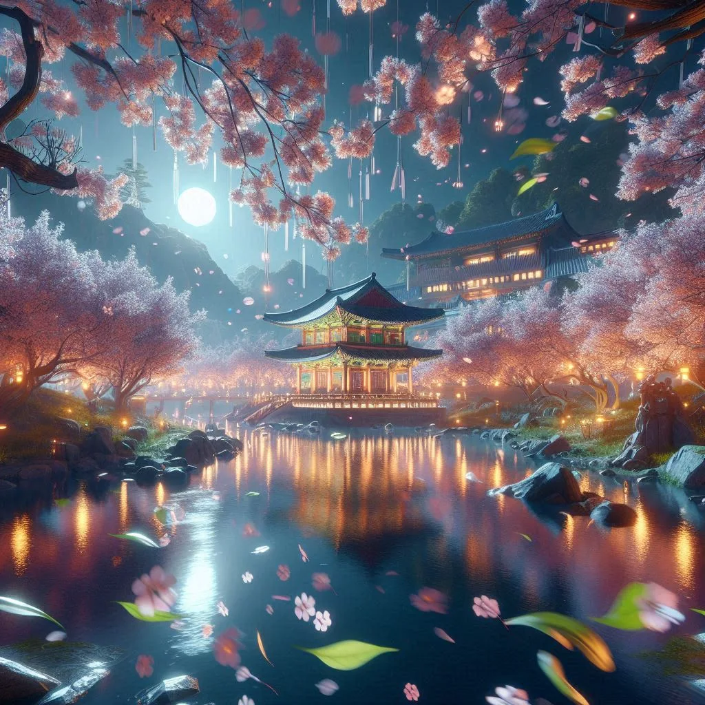3D rendering of a fantasy scene with a lake surrounded by cherry blossom trees. Leaves are falling into the water. In the background is a traditional Korean building with lights on at night. The water reflects the scene above it. The entire image is illuminated with light and color.